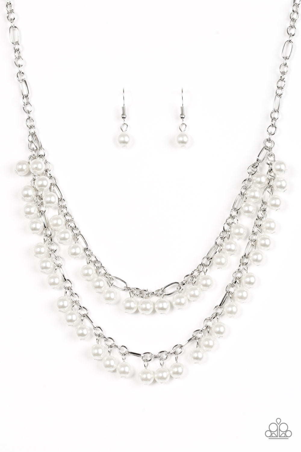 Classic white pearls swing from the bottom of mismatched silver links, creating refined layers below the collar for a timeless look. Features an adjustable clasp closure.