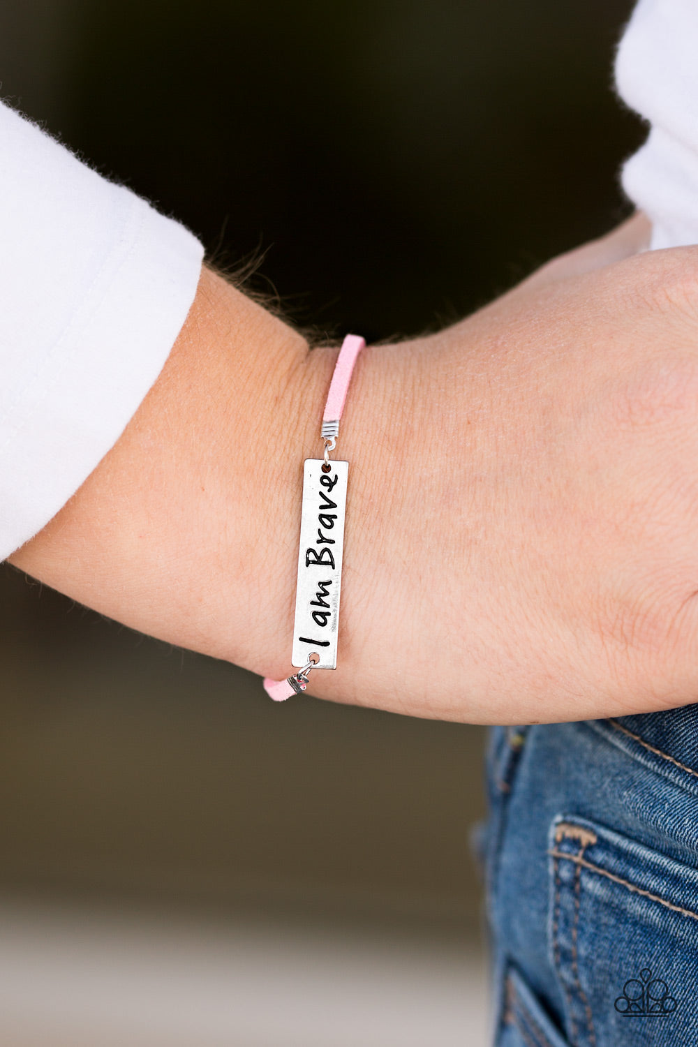 Stamped in the phrase “I am Brave,” a shimmery silver plate attaches to strips of pink suede for a whimsical look around the wrist. Features an adjustable clasp closure.