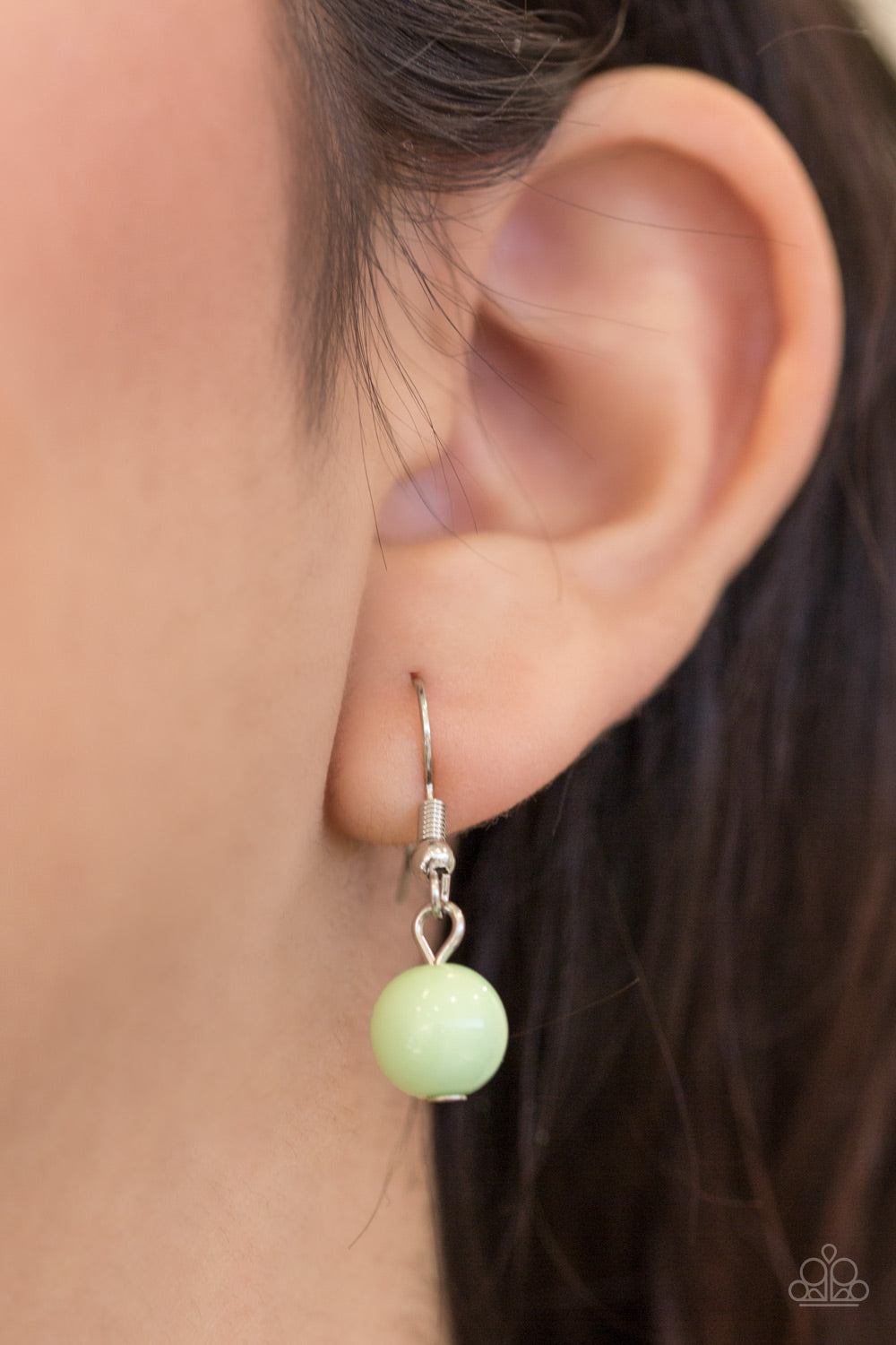 Glassy and polished green beads trickle from the bottom of two shimmery silver chains, creating a layered fringe below the collar. Glittery white rhinestones drip between the colorful beads, adding a refined shimmer to the bubbly palette. Features an adjustable clasp closure.