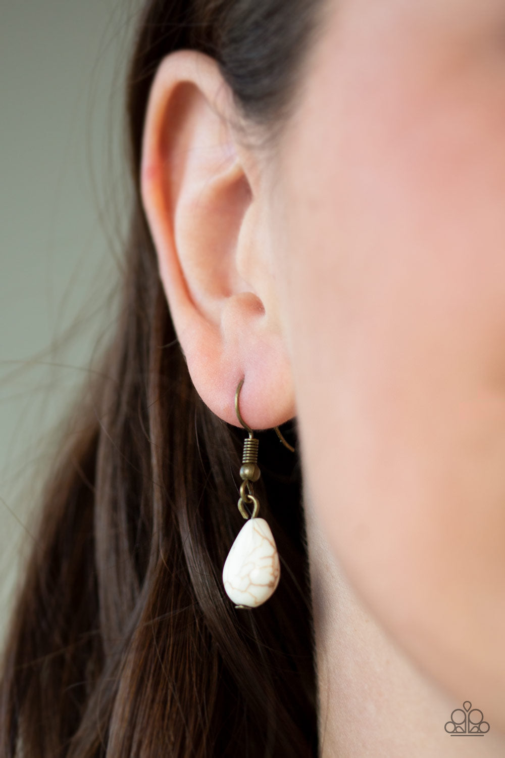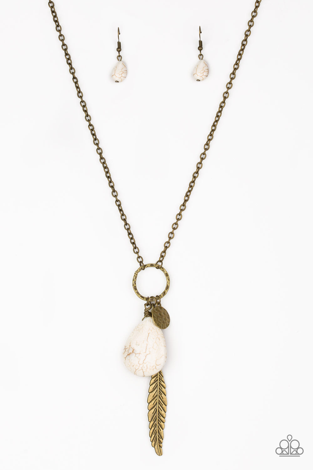 Infused with an elongated brass chain, a hammered brass disc, shimmery feather charm, and a refreshing white teardrop stone swings from the bottom of a hammered hoop, creating a whimsical tassel. Features an adjustable clasp closure.