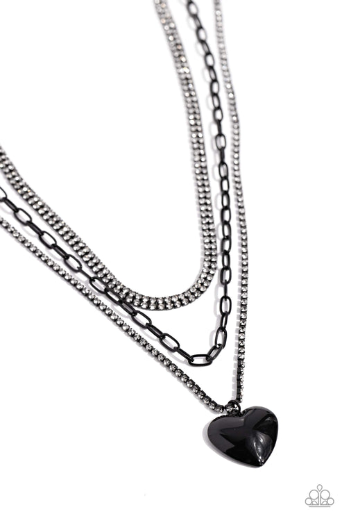Featuring a black-painted hue, a trio of paperclip, rhinestone-encrusted box chain, and layered rhinestone-encrusted box chains coalesces down the neckline for a monochromatic masterpiece. Strung on the lowermost black box chain, a black heart pendant stands out and reflects light in every direction for a statement finish. Features an adjustable clasp closure.