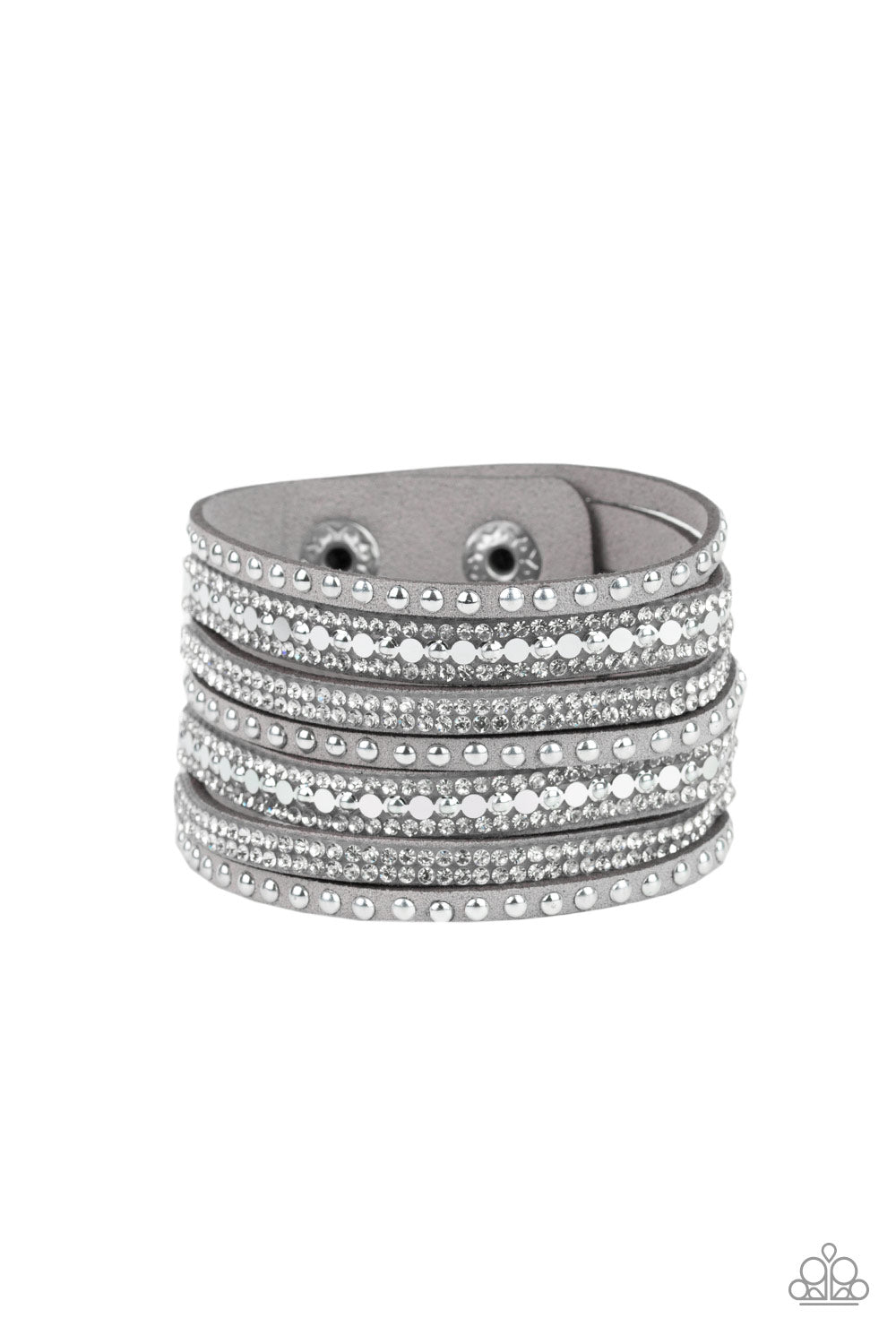 A thick gray suede band has been spliced into glittery strands encrusted in a collection of dainty silver studs, glittery white rhinestones, and flat silver sequins for a sassy look. Features an adjustable snap closure.